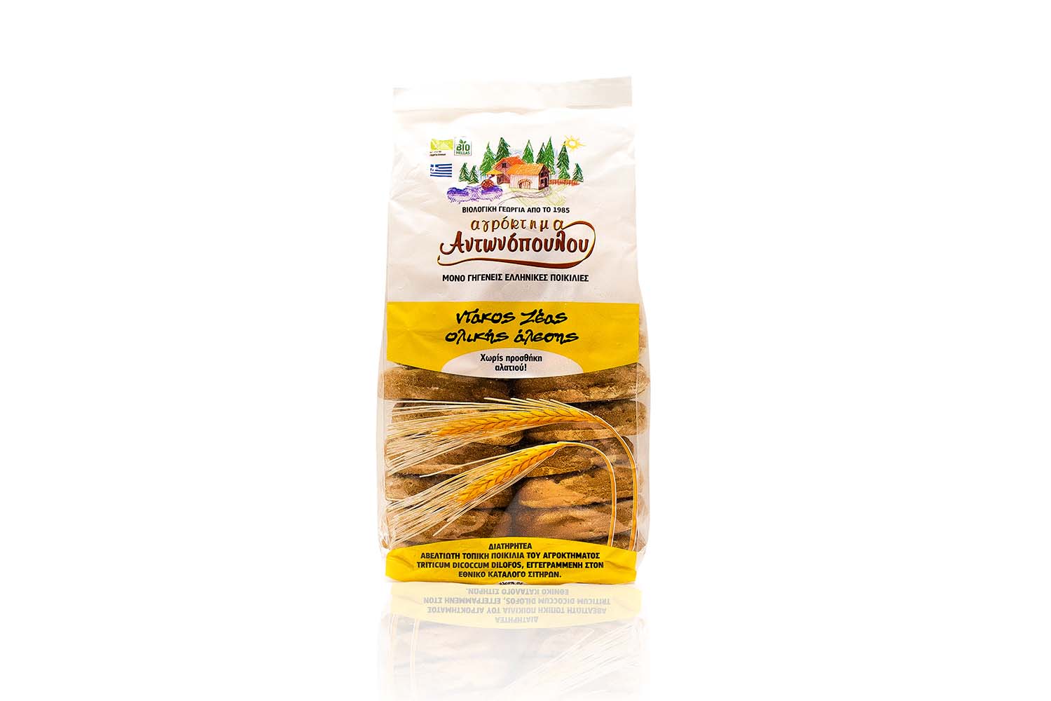 Παξιμάδι ζέας με προσθήκη χαρουπιού ολικής άλεσης βιολογικής γεωργίας από την διατηρητέα αβελτίωτη τοπική ποικιλία του αγροκτήματος «Triticum dicoccum Dilofos», εγγεγραμμένη στον Εθνικό Κατάλογο Σιτηρών μετά από πολύχρονο αγώνα.